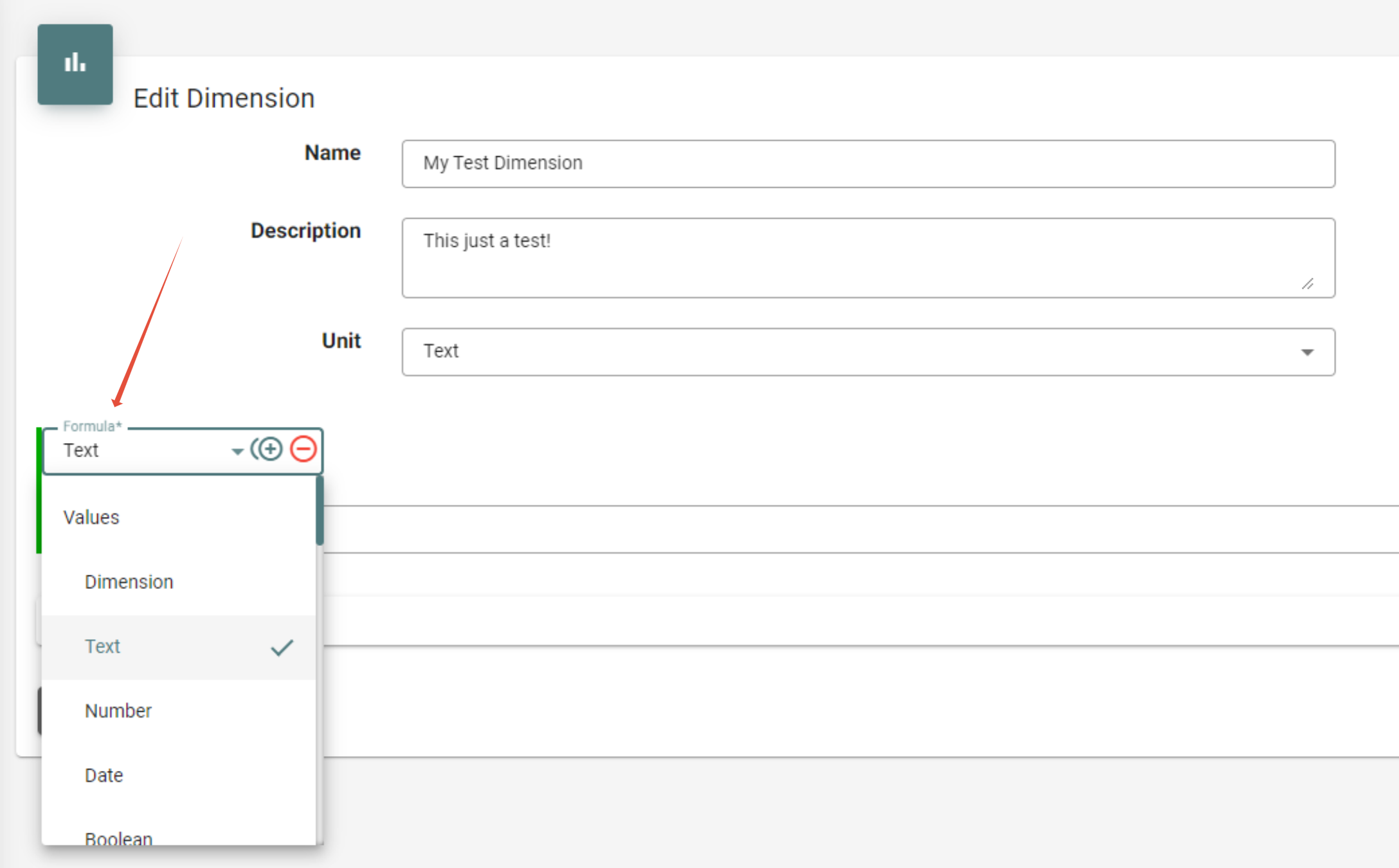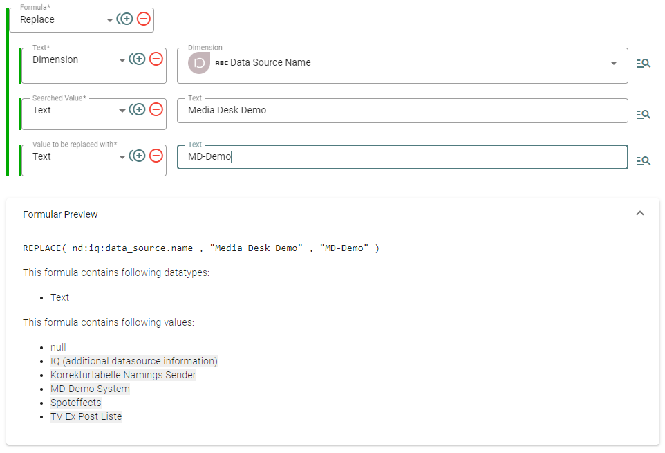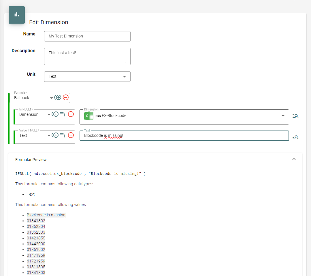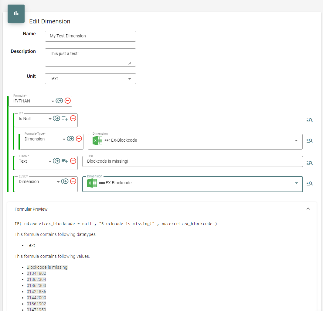 Values: Erlaubt das Setzen von (zumeist Text-)Werten in die neue Dimension. Dies kann ein Text, ein Datum, ein Wahrheitswert (Boolean) oder der Wert einer anderen Dimension sein. Die Values-Formel wird oft in Kombination mit anderen Funktionen verwendet, um beispielsweise den Text einer Dimension zu transformieren.