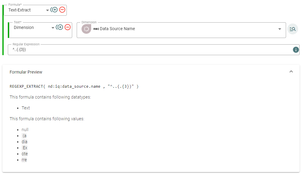 Um aus der Dimension "Data Source Name" das dritte bis fünfte Zeichen zu extrahieren, nutzen wir Regular Expressions, die es ermöglichen, präzise Teilsequenzen aus einem Text zu identifizieren und zu extrahieren. In diesem Fall möchten wir eine Teilzeichenfolge basierend auf ihrer Position im Text extrahieren.