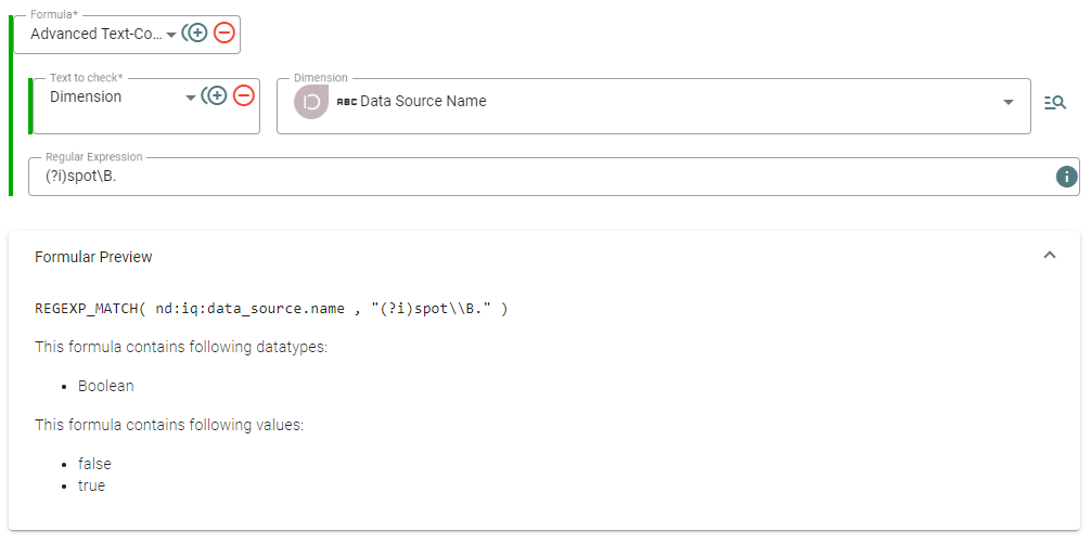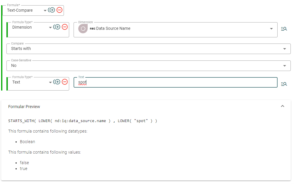 Angenommen, Sie möchten überprüfen, ob der Data Source Name mit dem Wort "spot" beginnt. Diese Überprüfung kann beispielsweise nützlich sein, um Filter für Data Shares zu erstellen oder um den zurückgegebenen Wahrheitswert in Bedingungsformeln (Condition-Formeln) weiterzuverarbeiten.