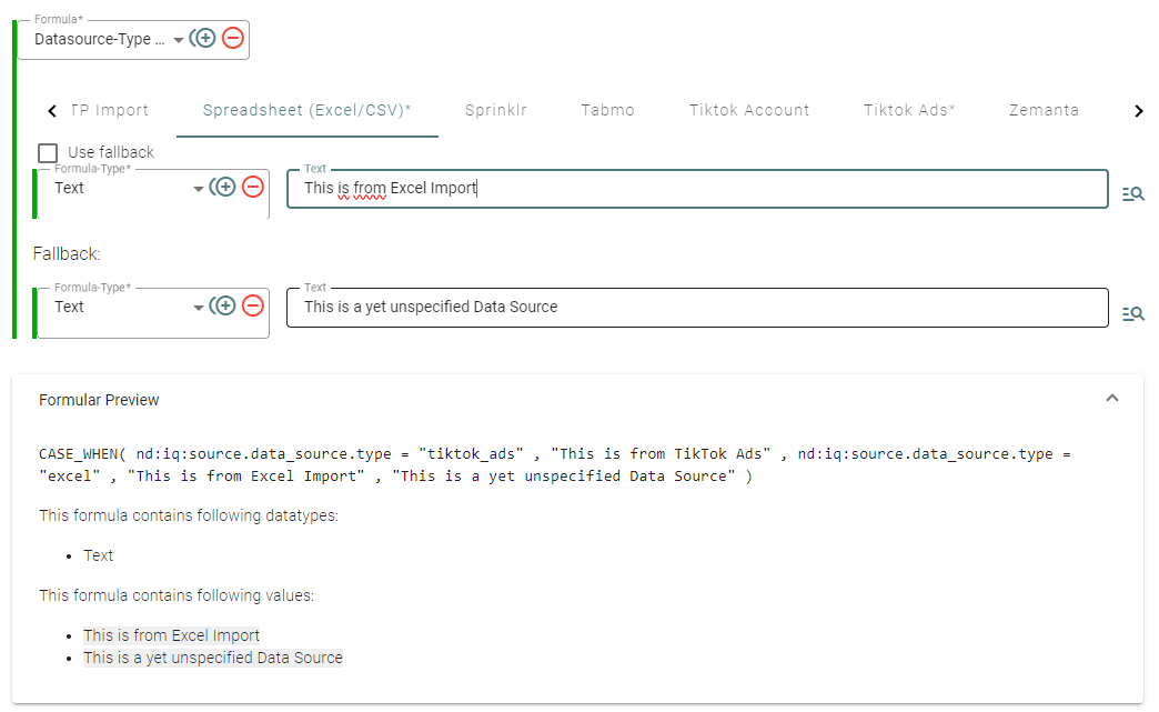 Individuelle Formeln oder Werte je Datenquellentyp mit Fallback-Option